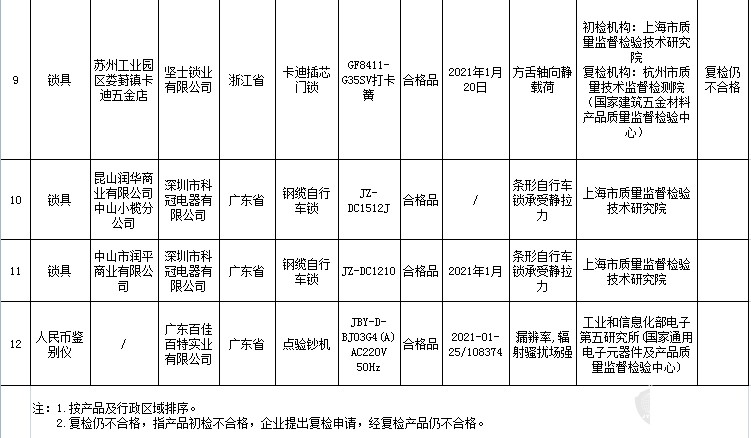 12月13日,市场监管总局发布2021年安全防范产品质量国家监督抽查情况,本次抽查了228家企业生产的238批次产品,涉及安全带、安全网、锁具、人民币鉴别仪等4种安全防范产品,共发现12批次产品不合格,不合格发现率为5.0%。本次跟踪抽查到上次不合格企业8家,有1家企业本次抽查仍不合格,7家企业合格。